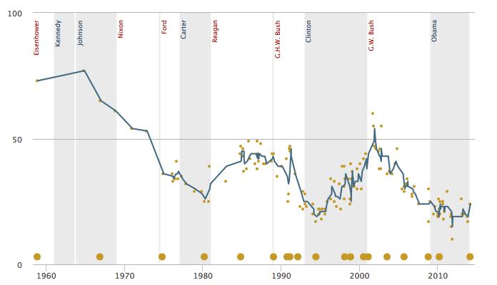 The chart below (produced by the Pew Foundation) illustrates this point. There has been precipitous decline in the percentage of Americans who trust the government “always” or “most of the time.”